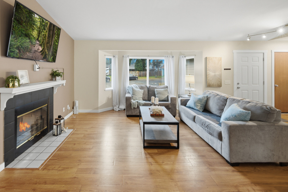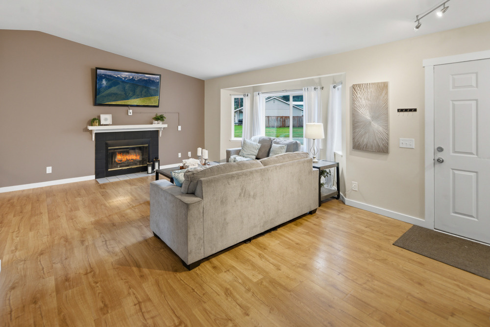 Pride of ownership is evident throughout this beautifully maintained, single-story home in North Marysville’s coveted Sherwood Forest neighborhood. This house lives larger than its 1,216 square feet, letting you feel right at home the moment you open the door. The generous living room boasts a lovely bay window, LVP flooring, and a gorgeous wood-burning fireplace with hearth and mantle. The vaulted ceilings, large windows, and skylights successfully create a bright and airy ambiance throughout. Enjoy the spacious and sunny kitchen featuring stainless steel appliances, a breakfast bar, a built-in desk, and plenty of cabinets for storage. Down the hall is a generous primary suite, complete with a full ensuite bathroom, two generous guest bedrooms, and a guest bathroom.