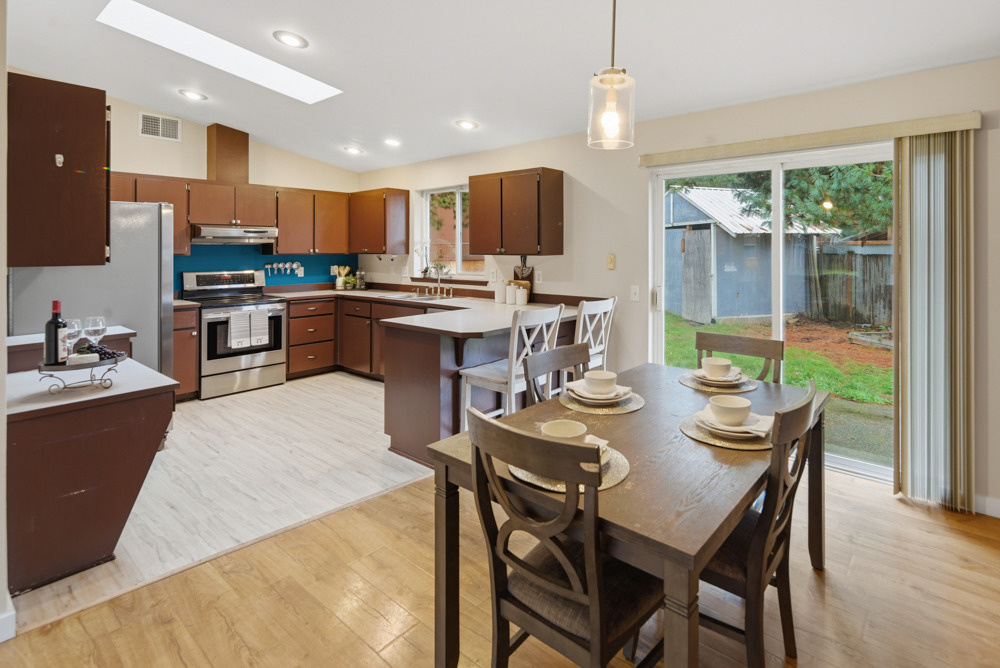 Spacious dining area with slider leading to private backyard oasis